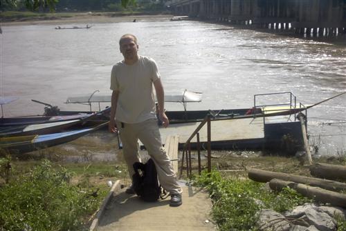 Als wir irgendwo auf der anderen Uferseite anhalten, steht ein Boot bereit, das Touristen flußaufwärts fahren wird. Ich lasse eben den Mopedfahrer ein Foto machen, mich im Vordergrund, dahinter das Boot an der Anlegestelle. Geduldig warten die Leute, bis das Prozedere vorüber ist.
