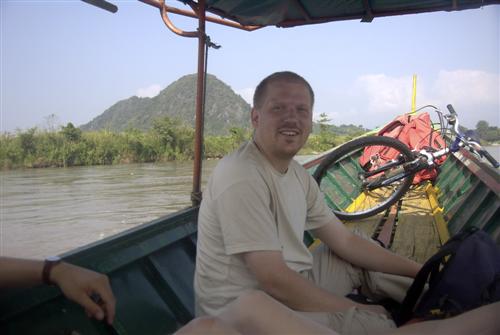 Kurzerhand bietet er mir an, mich dorthin zu fahren. Ich zögere zuerst, da es eigentlich mein Ziel ist, auf eigene Faust diese Anlegestelle zu finden. Aber, wie so immer, die Faulheit siegt und so steige ich hinten drauf. Rasant geht es durch kleine Gassen, bis wir auf einer breiten Straße landen. Wir überqueren schließlich den Kok-Fluss.