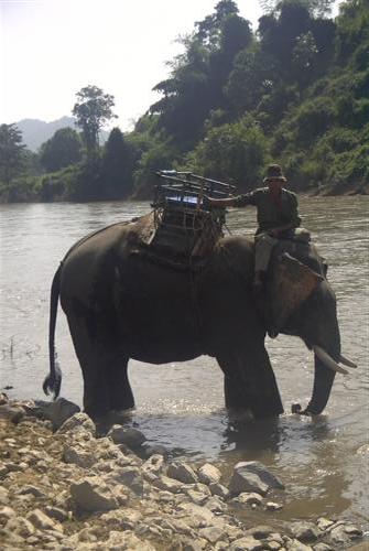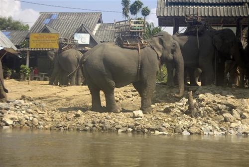 Mit dem Boot geht es zu einem kleinen Touristendorf. Als wir ankommen, werden wir herzlich von den Leuten empfangen, die dort ihr Geld verdienen. Es stehen viele Elefanten am Ufer und deren Halter warten auf Leute, die auf ihnen einen Ausritt wagen wollen.