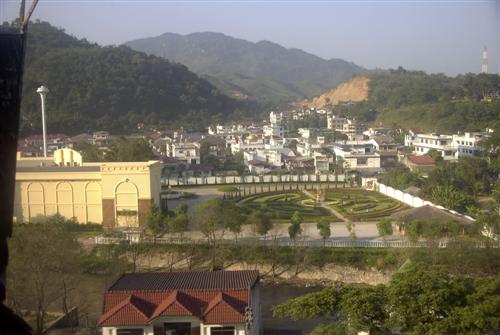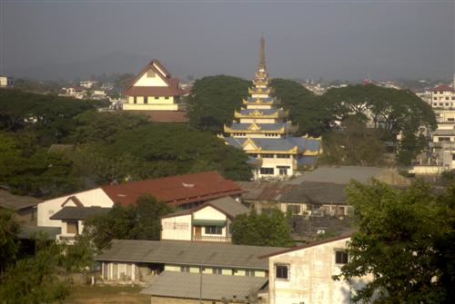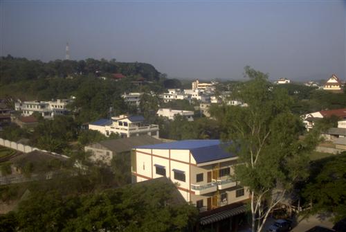Im Schatten sind Teile der Hotelanlage, im Hintergrund Tachileik zu erkennen.
