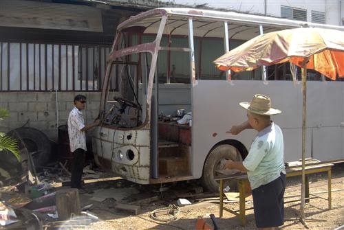 Ich beobachte zwei Thailänder, wie sie einen alten schrottreifen Bus wieder zusammenflicken. Das ist echt abenteuerlich, wie sie da herumhantieren. Beide sind total gelassen. Sie lassen sich gerne fotografieren.