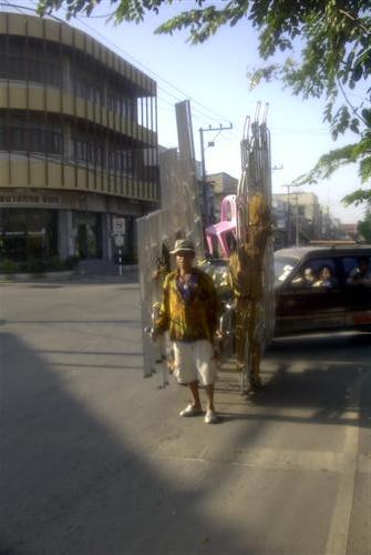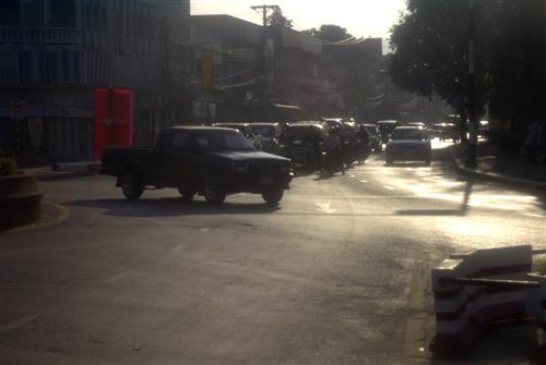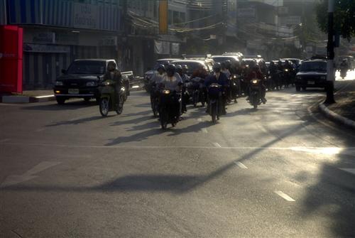 Als ich die Straße in Lampang entlang gehe zum Bahnhof, fallen mir die vielen Motorradfahrer auf, die hier in der Stadt herumgurken. Ich finde das beeindruckend, da sie immer in einem Riesengewühl an jemandem vorbeikommen. Also mache ich einige Aufnahmen von ihnen. Es ist frühmorgens gegen sieben Uhr dreißig und ich erwische die Leute, wie sie zur Arbeit tigern.