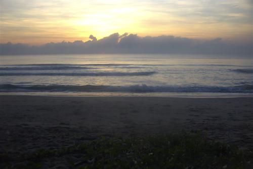 Das Frühstück ist fantastisch. Ich genieße den Blick durch die Bäume hinweg auf das Meer. Etwas später zahle ich und gehe sodann vergnügt den Strand weiter entlang. Ich habe das Gefühl, die Wellen werden immer höher. Die Sonne hat hier hohe Intensität.