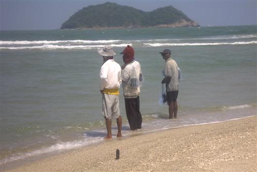 Dort sind viele Fischer und Familien. Die See ist rau, der Sand ist sehr feinkörnig.