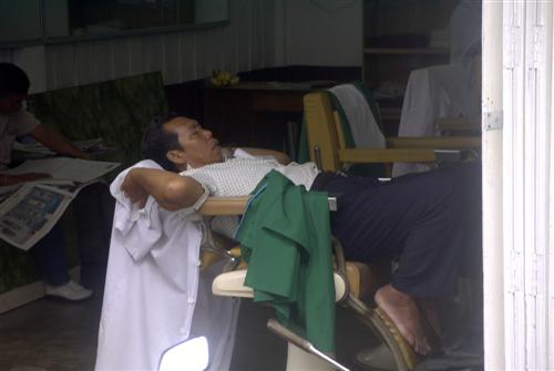 Auf dem Heimweg zu meinem Gästehaus werde ich noch auf einen laut schnarchenden Kunden bei einem Barbier aufmerksam.