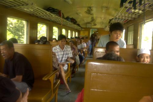 Die Leute verhalten sich sonderbar ruhig, anders als sonst. Zwischendurch passieren thailändische Militärangestellte mit Maschinengewehr das Abteil. Ohne die Militärbeamten sind mir auch ein paar schöne Bilder im Zug gelungen. Plötzlich denke ich über Ausweglosigkeit nach, wenn man sich in eine Risikosituation begibt. Aber, hey, es wird schon schief gehen. Ich komme mit einer netten Lehrerin aus Naratiwat ins Gespräch. Sie sagt, sie fahre ebenfalls in ein paar Tagen nach Malaysia. Ob ich sie dort treffen soll, überlege ich mir. Naja, die Zugfahrt geht weiter und nach anderthalb Stunden erreichen wir endlich Sungai Golok. Erleichterung macht sich bei mir breit. Hier einige Zugaufnahmen: