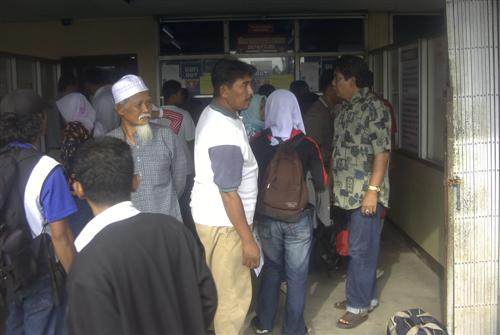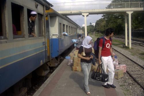 Mir fällt auf, dass ist auch keine so ausgelassene Stimmung im Zug wie sonst. Nach einer Weile sind wir dann in Sungai Golok angekommen. Die Leute steigen mit Sack und Pack aus. Ich fotografiere noch ein verschleiertes Mädchen mit ihrem Freund auf dem Bahngleis