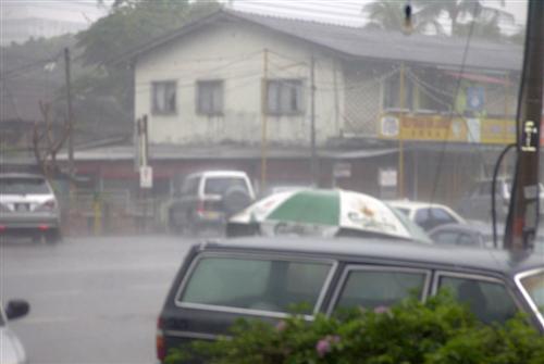um nach Kuala Lipis aufzubrechen. Da ich ja eh erst mal sehen will, wie die Busse in Richtung Süden fahren, genehmige ich mir vorher ein ausgiebiges Frühstück bei einem Chinesen. Ich muß mich beeilen, denn ein starker Monsun ist im Anmarsch. Aber ich kann mich gerade rechtzeitig in das chinesische Straßenrestaurant retten. Das regnet vielleicht, wahnsinn!