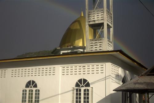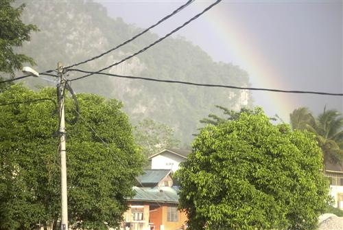 Ich suche nach Orientierung, da wir hier vollkommen dezentral sind. Ein freundlicher Mann erklärt sich bereit, mich mit seinem Auto ein Stück mitzunehmen. Kurz vor Ortszentrum läßt er mich raus und ich gehe den Rest zu Fuß. Hier ist es ganz schön am regnen zurzeit. Bemerkenswert ist, dass nach einem deutlichen Regenfall immer die Sonne folgt. So zeigt sich ein schöner Regenbogen.