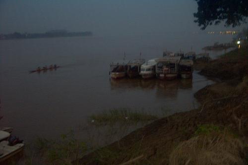 Ich entdecke begeisterte Ruderer in wahnsinnig schmalen Booten nach Einbruch der Dunkelheit auf dem Mekong.