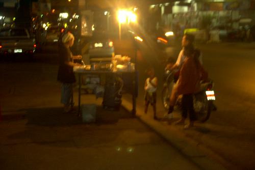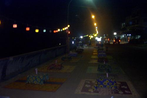 Ich gehe nun in die entgegengesetzte Richtung immer an der Promenade entlang. Es ist mittlerweile stockdunkel. An kleinen Ständen wird Essen verkauft.