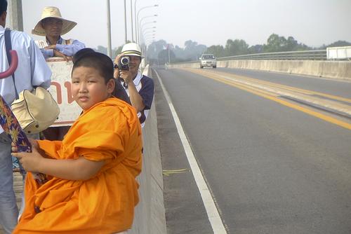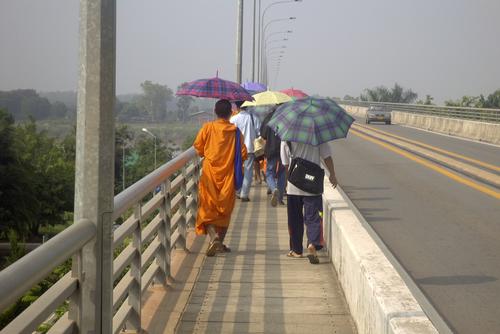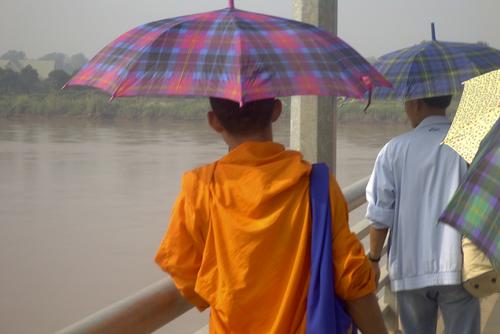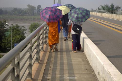 Hier ist es total amüsant, nachdem ich irgendwie den Weg auf die Brücke gefunden habe, sehe ich einige Mönche großen Schrittes auf die thailändisch-laotische Grenze zugehen.