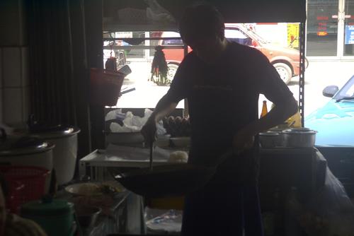 Erste Entdeckung: Leckere Möglichkeit zu essen in einem kleinen Restaurant vor der Geschäftswelt von Lampang. Es gibt gebratenen Reis mit Hühnchenfleisch zum Frühstück. Dazu gibt es eine eiskalte Cola.