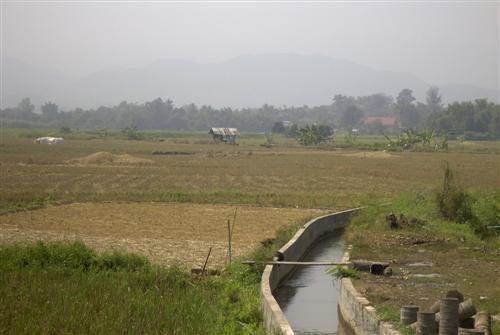 Ich gehe etwas aus dem Ort raus. Es ist wahnsinnig schön. Alles Reisfelder, am Horizont die Berge, die Sonne scheint,